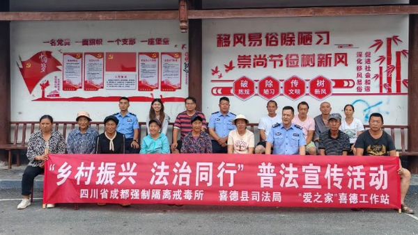 为扎实推进法治乡村建设,进一步增强基层群众法治观念,9月5日,四川省成都强制隔离戒毒所联合凉山州喜德县司法局、“爱之家”禁毒防艾法律服务喜德工作站前往喜德县光明镇幸福村开展以“乡村振兴法治同行”为主题的送法进乡村法治宣传活动。