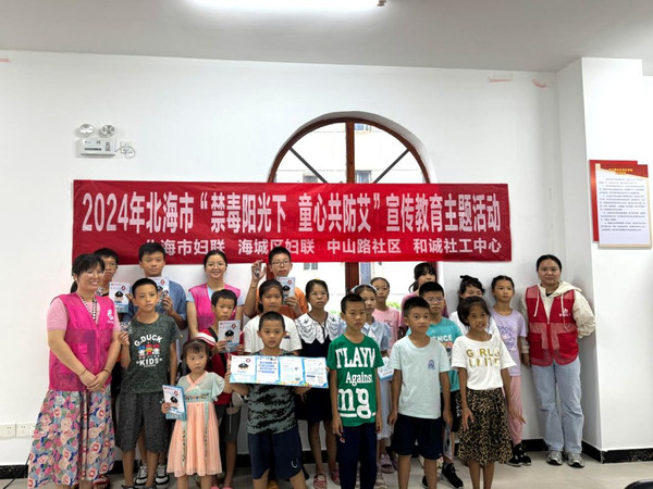 为提高未成年人的自我保护意识,远离毒品,营造珍视生命、阳光向上的精神风貌,8月15日上午,北海市妇联联合海城区妇联在中山路社区开展2024年北海市“禁毒阳光下 ‘童’心共防‘艾’”宣传教育主题活动。