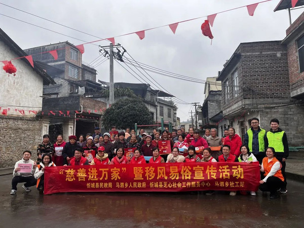 1月11日上午,马泗乡联合县民政局、县芝心社会工作服务中心、乐雅社工、县幼志愿者、乡社工站在马泗村马伍屯开展“慈善进万家”暨移风易俗宣传活动,向群众传递关怀和温暖。