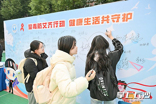 “我承诺,坚决抵制毒品,积极参与禁毒防艾宣传!”12月1日上午,湖南师范大学木兰路篮球场上回荡着铿锵的宣誓声。多所高校的禁毒防艾志愿者方阵整齐列队,在第三十八个“世界艾滋病日”庄严许下青春诺言。