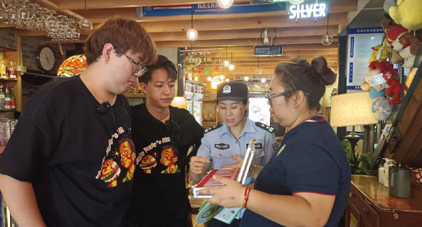 在国庆节来临之际,为进一步加大辖区内酒吧、宾馆禁毒宣传力度,提高场所从业人员的识毒、防毒、拒毒意识,近日,东城区交道口街道社戒社康工作站联合派出所走进南锣鼓巷周边酒吧、酒店,开展“防毒反毒,人人有责”禁毒宣传活动。