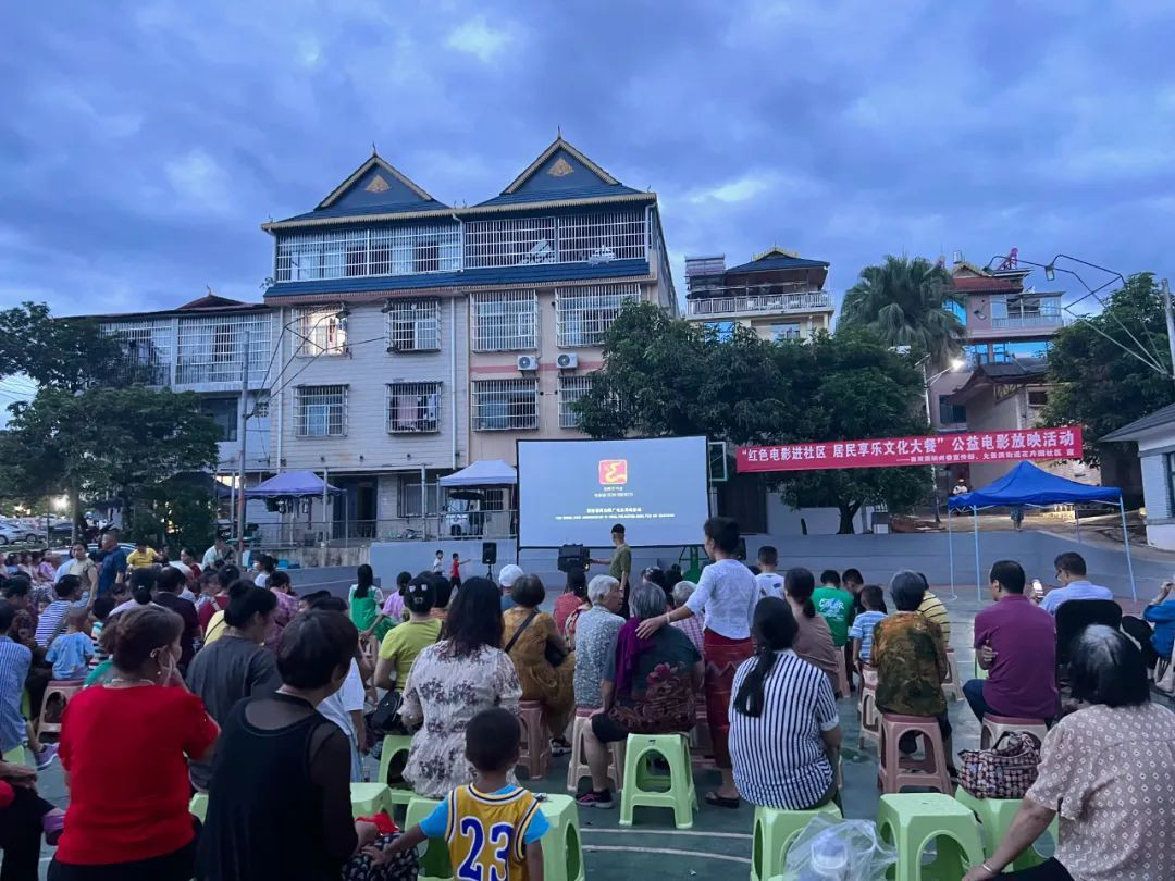 为丰富居民精神文化生活,扎实推动党史学习教育深入群众、深入基层、深入人心,由州委宣传部、允景洪街道花卉园社区联合举办的“红色电影进社区 居民享乐文化大餐”公益电影放映活动在花卉园社区开展。不少社区居民全家总动员,大家坐上凳子,在夏夜的晚风中看得津津有味。