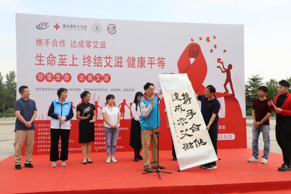 为提高全民艾滋病知晓水平,倡导大众建立健康生活方式、树立科学防病观,营造平等、包容、和谐的社会氛围,消除歧视,遏制艾滋病传播,2023年9月23日上午,门头沟区卫生健康委联合北京同心相随志愿者发展中心、北京性病艾滋病防治协会、北京市红十字会在门头沟区滨河世纪广场举办“携手合作 达成零艾滋”防艾主题宣传活动。