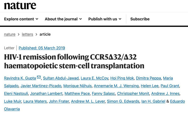 2019年3月5日,伦敦大学学院的研究人员在 Nature 期刊发表了一篇题为:HIV-1 remission following CCR5Δ32/Δ32 haematopoietic stem-cell transplantation 的论文【4】。报道了第二例被治愈的艾滋病患者——“伦敦病人”的治疗情况。