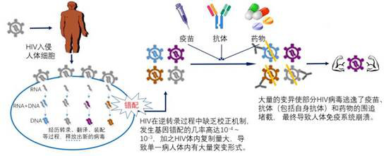 HIV的一个显著特点是在病毒复制产生子代的过程中,其遗传物质发生高度改变,这个特点不仅是HIV在免疫和药物压力下赖以生存的基础,也是病毒难以消除的主要原因和疫苗研制的主要障碍。有科学家估算“艾滋病病毒的进化速度大约是人类基因进化速度的100万倍”:其中一个原因是相较于真核细胞DNA聚合酶的错误率在10-10~10-9之间, HIV-1逆转录酶每个位点平均错误率高达到10-4~10-3之多[1],另外一个原因是HIV复制过程包含的众多环节中也同样可以产生碱基突变。随着HIV基因组的快速复制产生大量的子代病毒颗粒,这些变异被快速累积并逐步放大,并最终分化出不同的生物学功能。