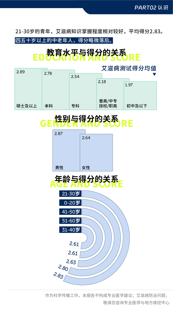 不同年龄段与性别的人,问答表现略有差异。其中,男性的艾滋病知识平均得分为2.87(满分为5分),显著高于女性的2.64分。此外,21-30岁的青年,艾滋病知识掌握程度相对较好,平均得分2.83。其次为不到20岁的青少年。四五十岁以上的中老年人,得分相对落后。