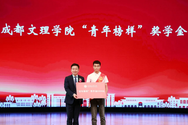 成都文理学院董事长刘学民为金堂首例造血干细胞捐献者高孝清泉颁发成都文理学院“青年榜样”奖学金。