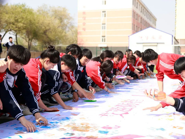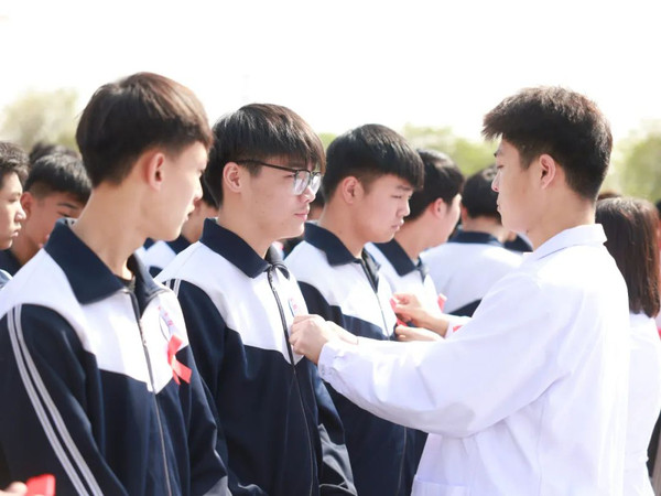 在学校操场,区疾控中心工作人员为学生志愿者佩戴红丝带,引导学生志愿者主动参与防艾宣传行动,并面向志愿者们开展了“艾的印章”活动。“红丝带学生志愿者”纷纷举起双手在布标上按上手印,并集体宣誓 “艾滋防控,人人有责,健康生活,从我做起”!