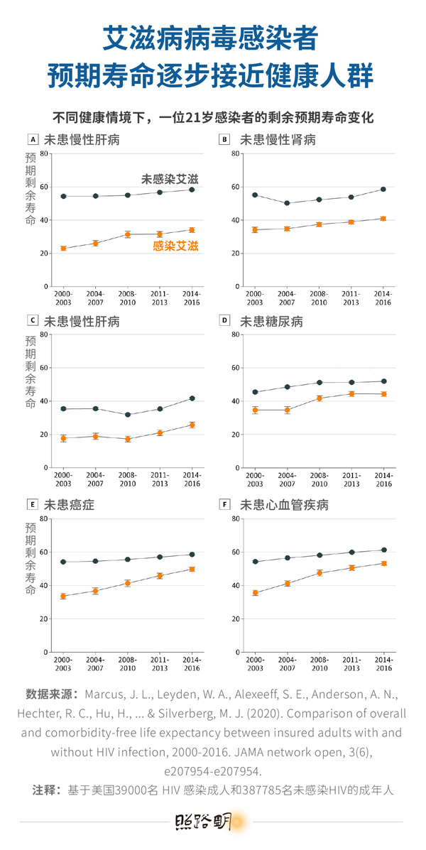 研究也表明,及时开始、持续接受ART治疗的艾滋病患者,寿命接近于普通人群。例如,一项大规模队列研究发现,如果在诊断后立即开始治疗,21岁的HIV感染者预期寿命可接近常规水平。其他研究也验证,艾滋病毒携带者的早期死亡率和普通人群无显著区别。