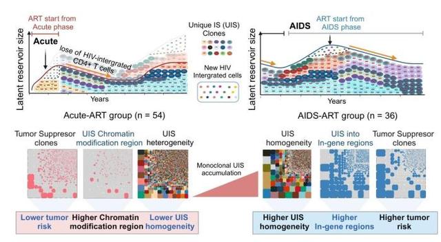 研究团队对HIV前病毒整合的宿主细胞基因功能分析显示,其寡克隆整合位点的基因相较于其他的整合位点,更倾向于富集在淋巴细胞激活和调控细胞周期相关的信号通路中。在AIDS阶段启动ART的患者,长期治疗形成的寡克隆整合位点,相较于急性期启动ART的患者,更倾向于出现在抑癌基因(TSGs)中,呈现更高的成瘤风险因素。