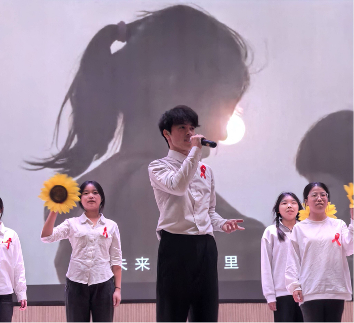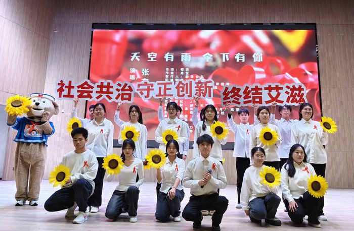 活动尾声,社团的防艾志愿者们带来合唱《天空有雨,伞下有你》,用温暖的歌声汇聚成爱的海洋,谱写美好愿景,他们一起发出有力的青春倡议——号召青年学生既做健康的守护者,也做温暖的“撑伞人”,此次合唱也成为活动最动人的“防艾宣言”。