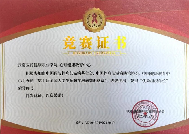 近日,由中国预防性病艾滋病基金会等权威机构联合主办的“2025年第十届全国大学生预防艾滋病知识竞赛”圆满落幕。云南医药健康职业学院心理健康教育中心(以下简称“中心”)广泛动员学生积极参与,荣获“优秀组织单位”称号,中心唐怡、谷言、姚懿纯、翟馨媛四位教师获评“优秀指导老师”。这项成绩充分展现了学校在艾滋病预防宣传教育方面的扎实成效与积极影响力。